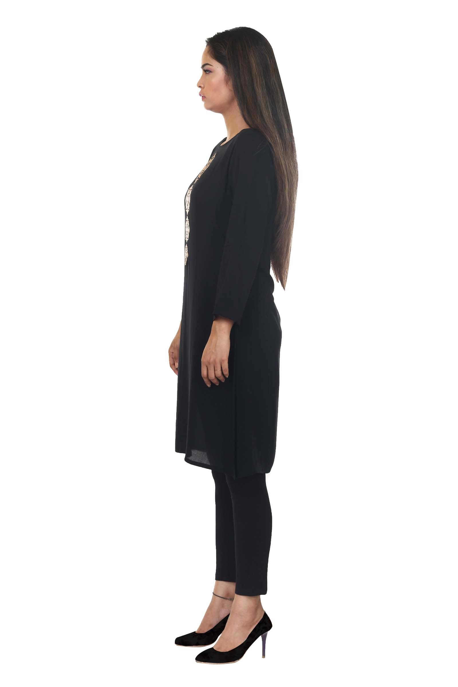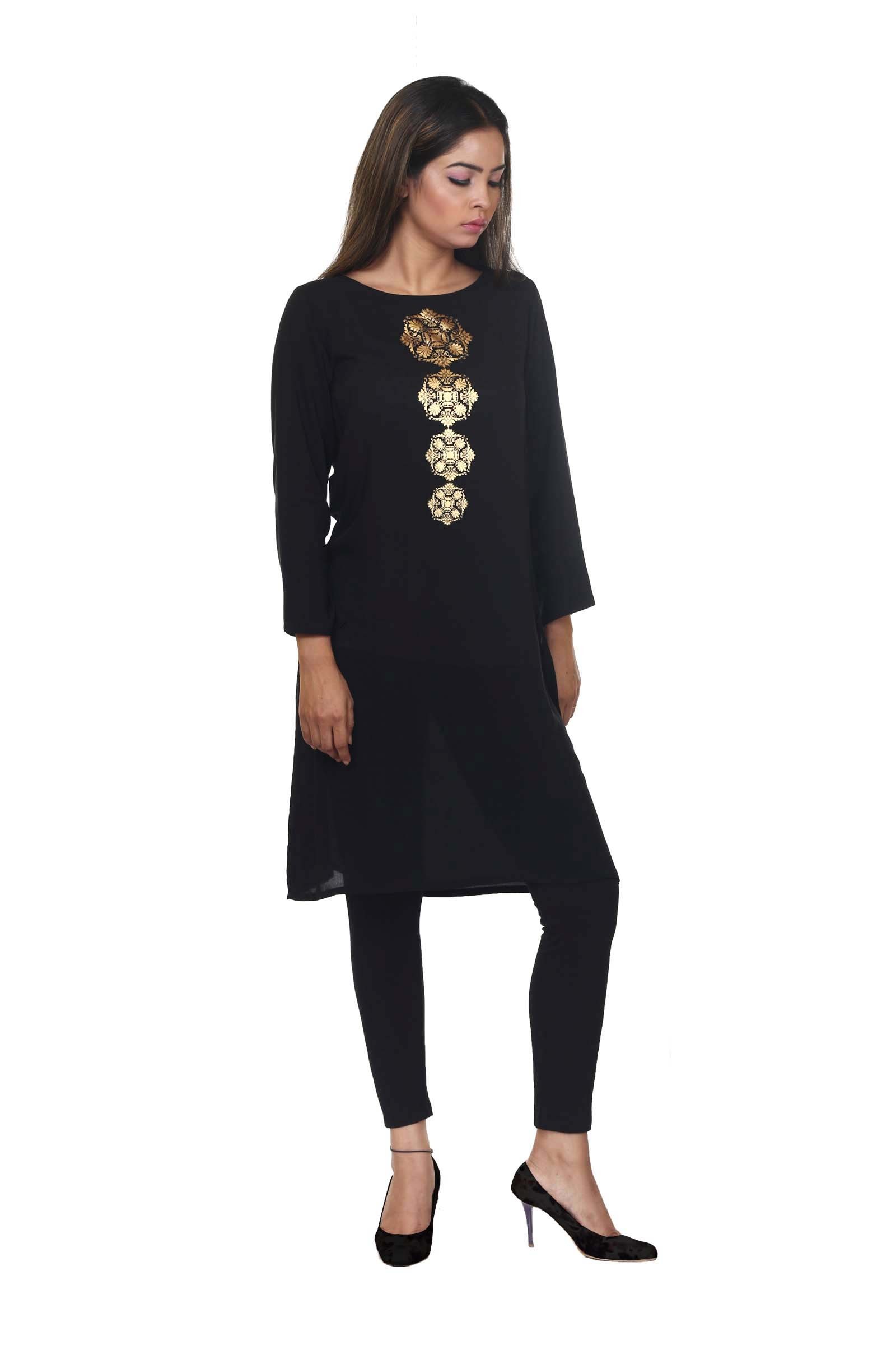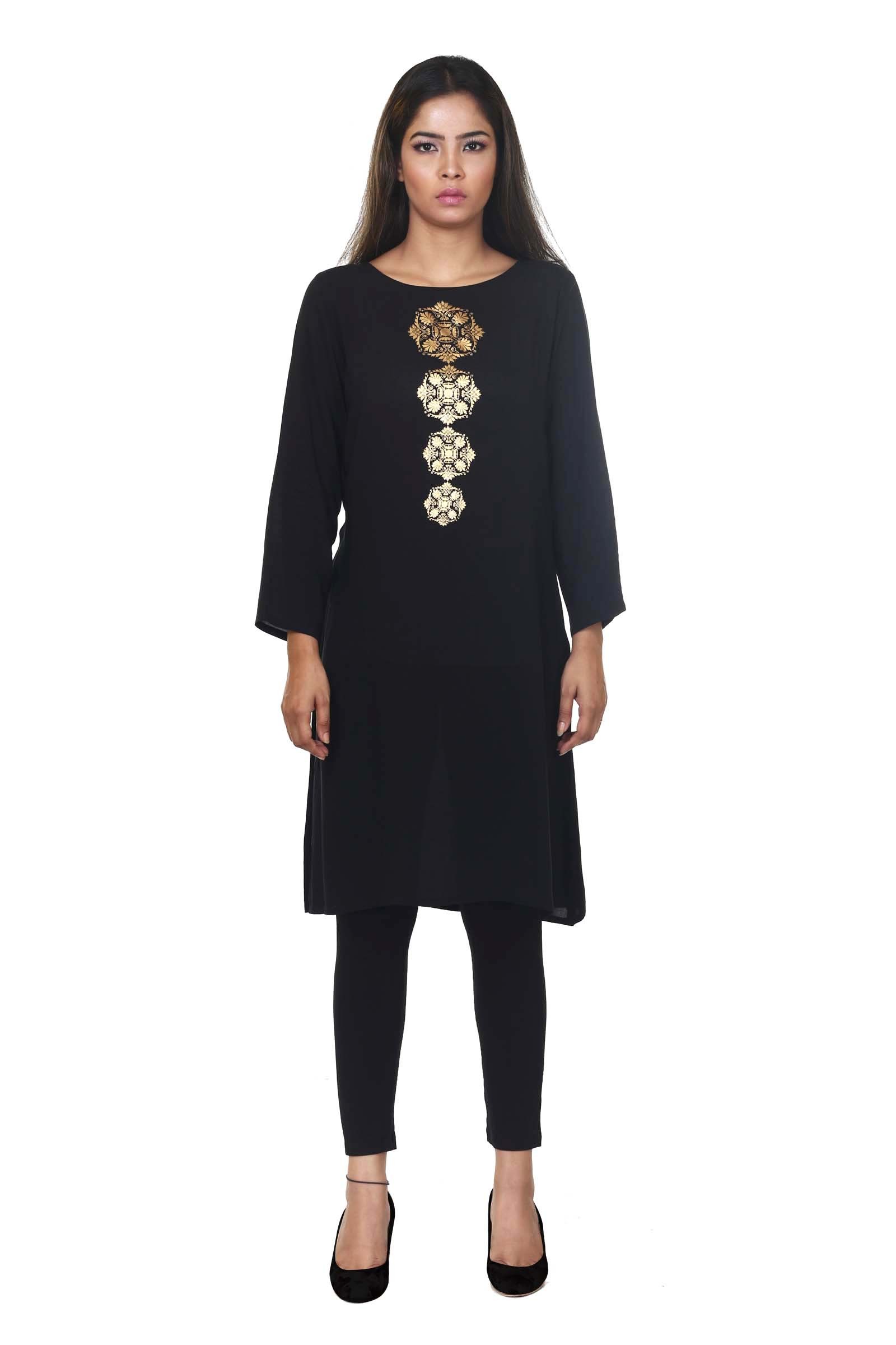 A light tunic with gold metallic print that is perfect for university or work!