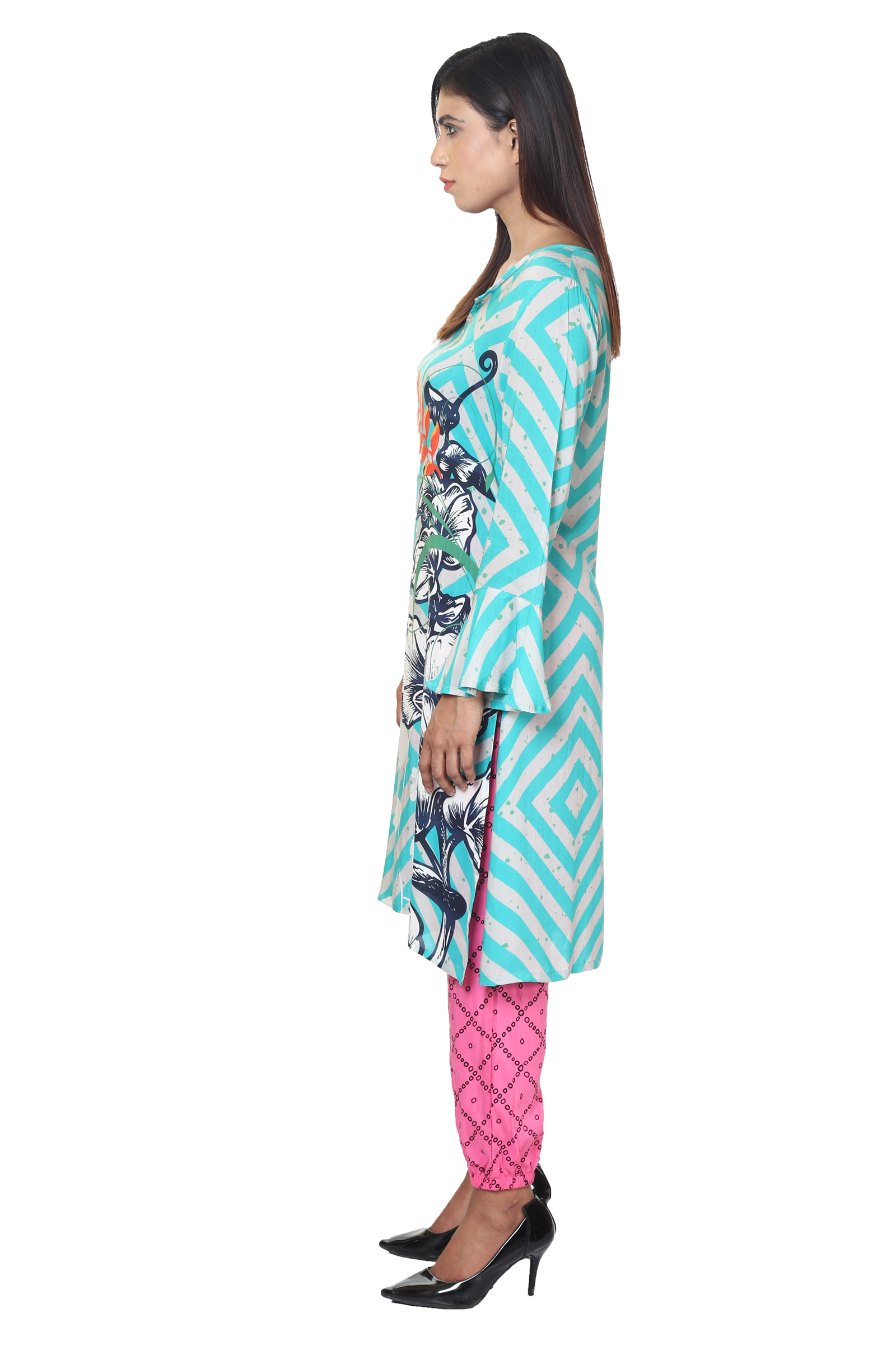 A digital printed tunic with geometric-floral motifs. Fabric Composition: Viscose