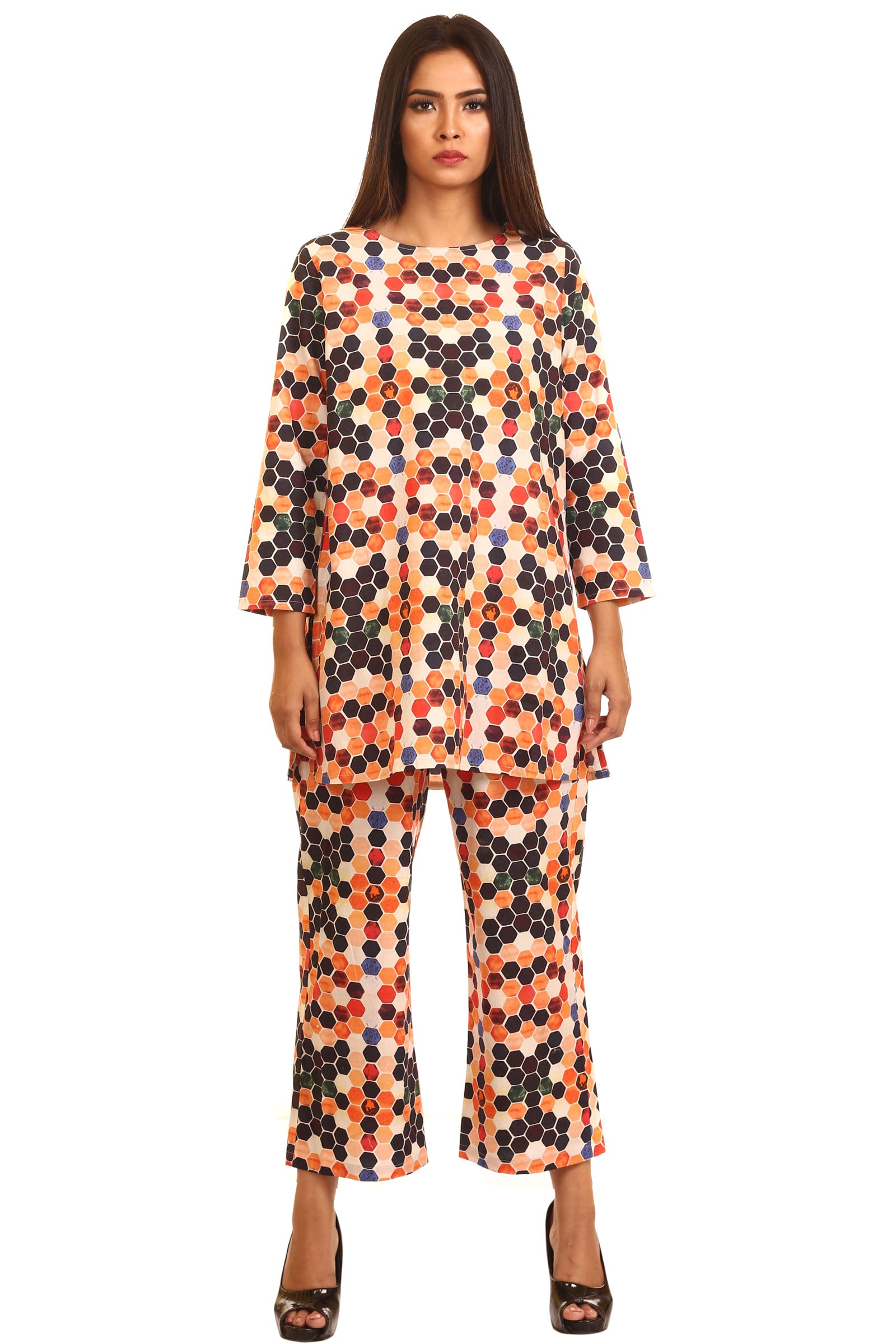 Tradition meets contemprary in this matching tunic and bottom set.